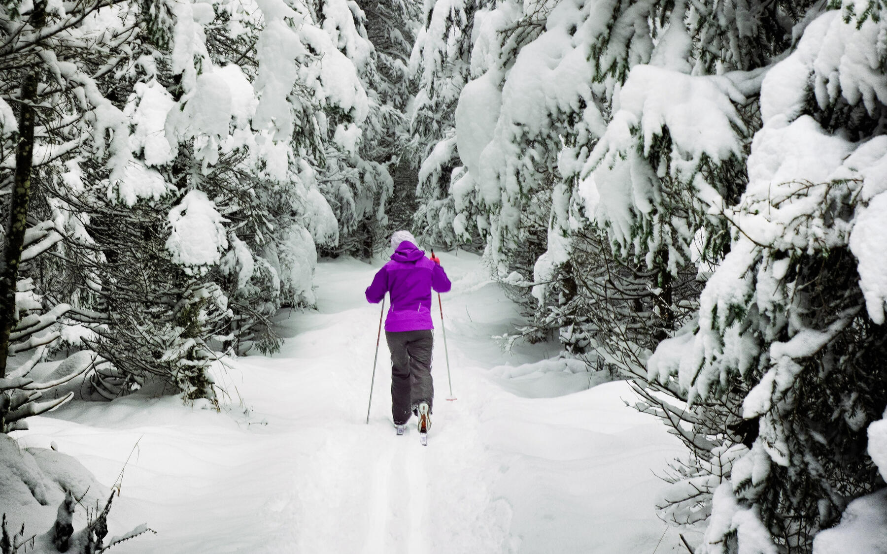 Quatre pistes de ski de fond de niveau facile sont damées et tracées régulièrement aux Sentiers de la Presqu'île. Notre sympathique équipe est sur place pour vous conseiller et alimenter les foyers extérieurs pour relaxer en fin de parcours. L'accès et le stationnement sont gratuits pour tous. Notez que les chiens ne sont pas admis dans les pistes et qu'il n'y a pas de location d'équipement sur place.