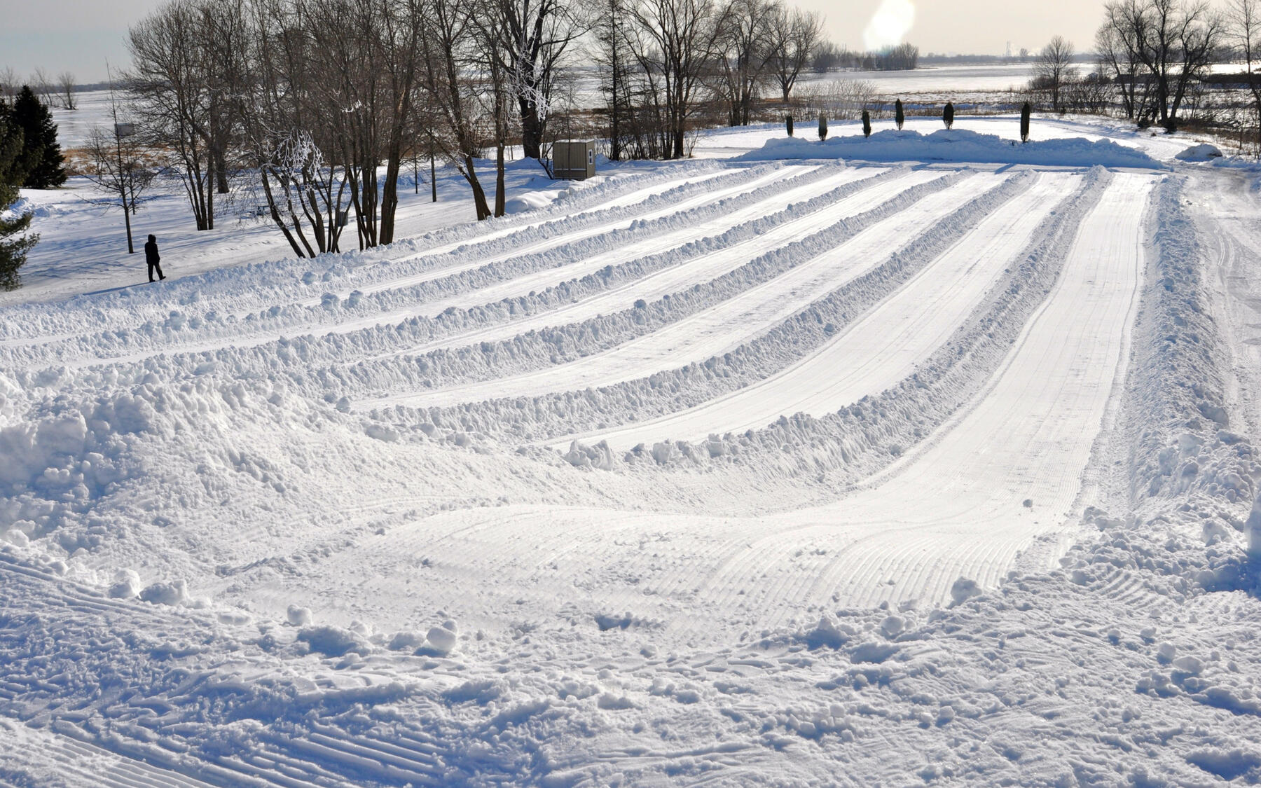 Une impressionnante quantité de neige est soufflée chaque année à la butte du parc de l'Île-Lebel afin de former des couloirs de glisse. Elle est ouverte chaque jour et éclairée en soirée. À vos traîneaux et soucoupes !